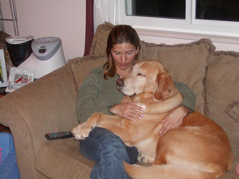 Owner of Run Play Stay, Jessica Brown, cuddling with Run Play Stay dog Rex during a B&B Overnight stay.